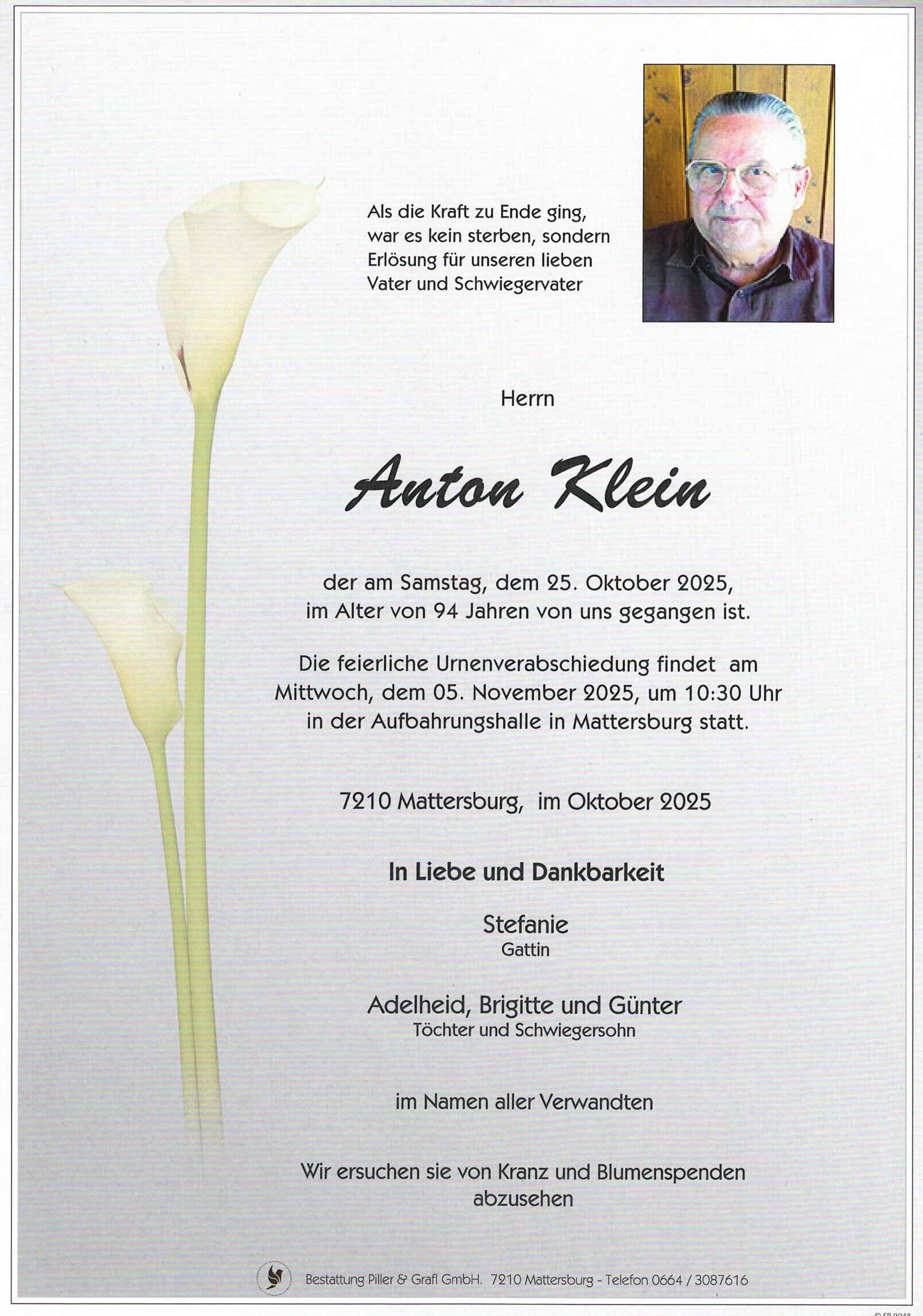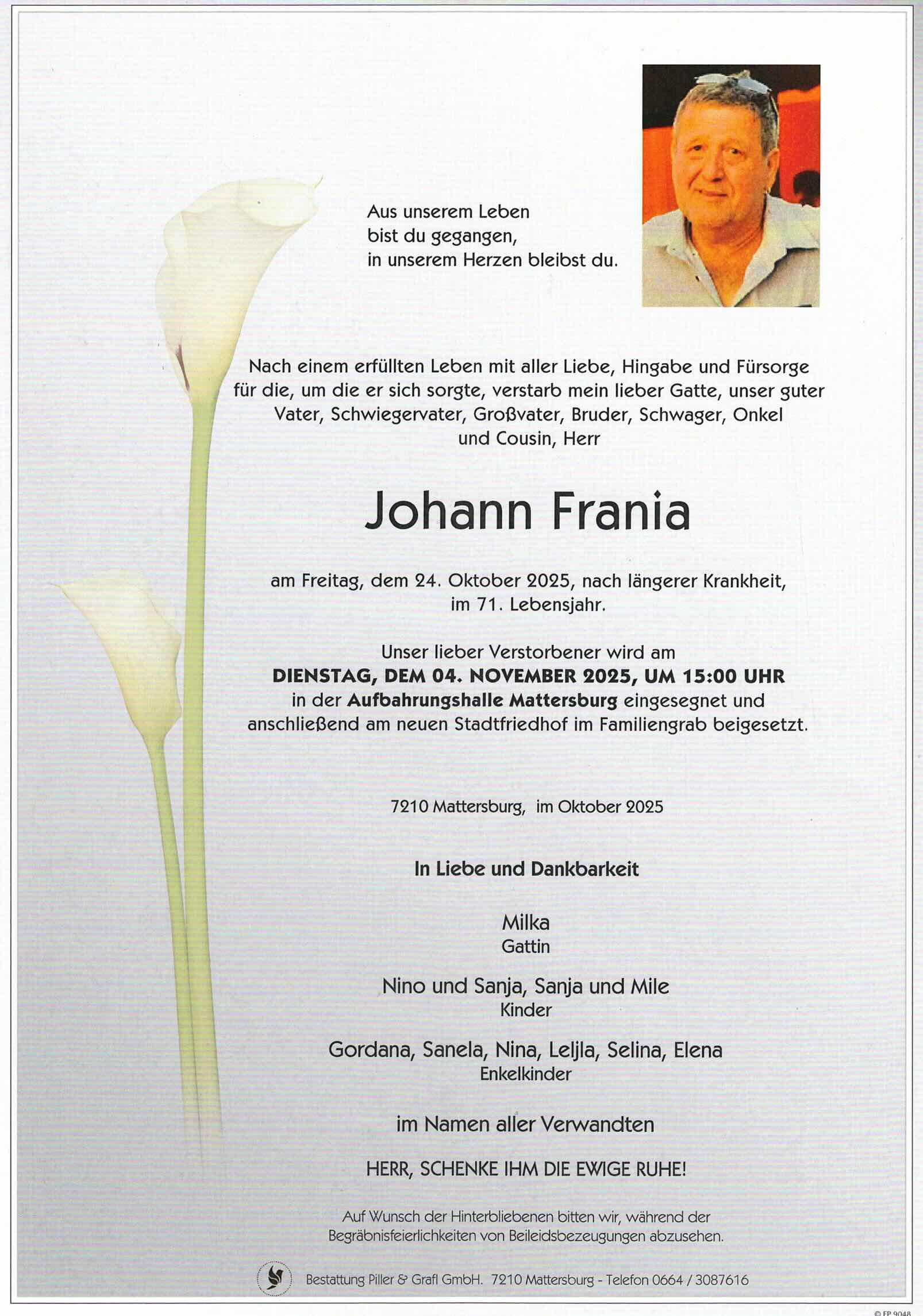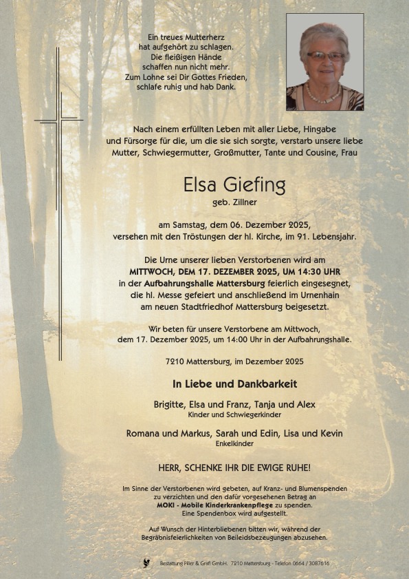 Begräbnis:21.10.2025, 15:00Stadtpfarrkirche Mattersburg