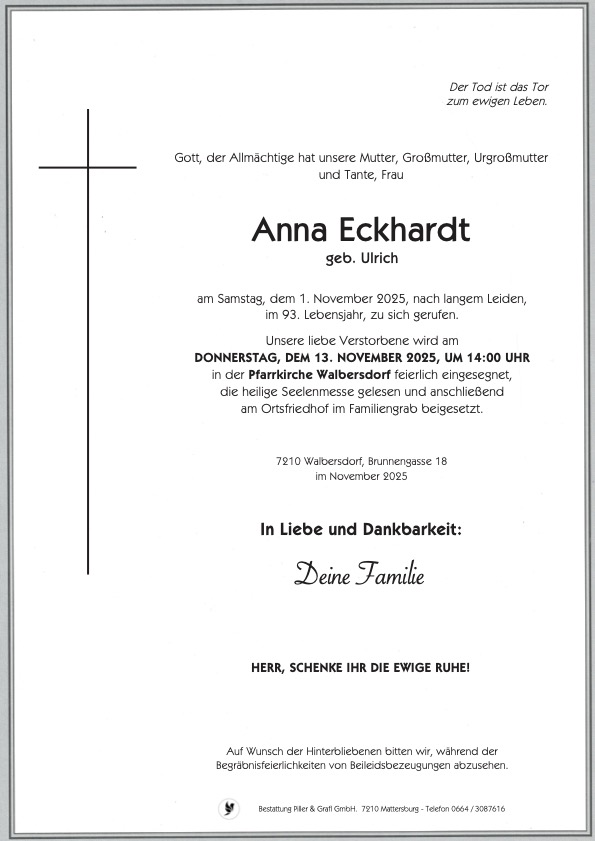 Begräbnis:11.09.2025, 15:00Ortsfriedhof Walbersdorf