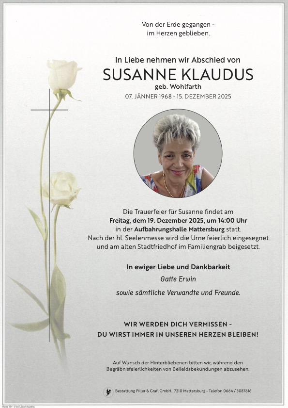 Begräbnis:19.12.2025, 14:00Aufbahrungshalle Mattersburg