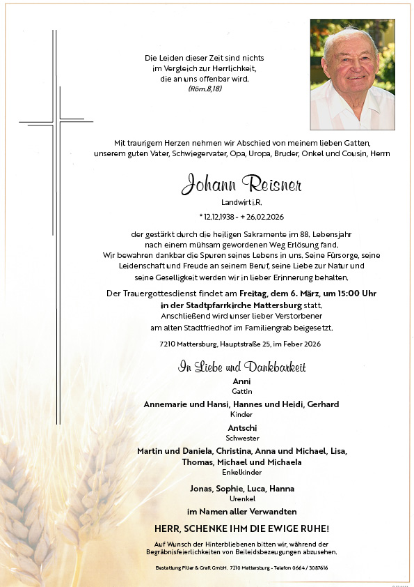 Begräbnis:06.03.2026, 15:00Stadtpfarrkirche Mattersburg